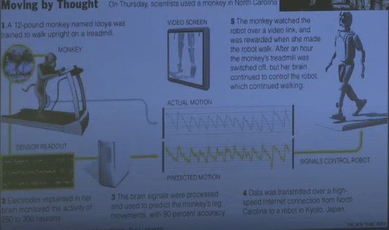 Im Vortrag von Dr. Charles Morgan wird auch ein Experimentgezeigt wie die Gehirne von Affen einen Roboter am anderen Ende der Welt steuern können – durch das Internet.