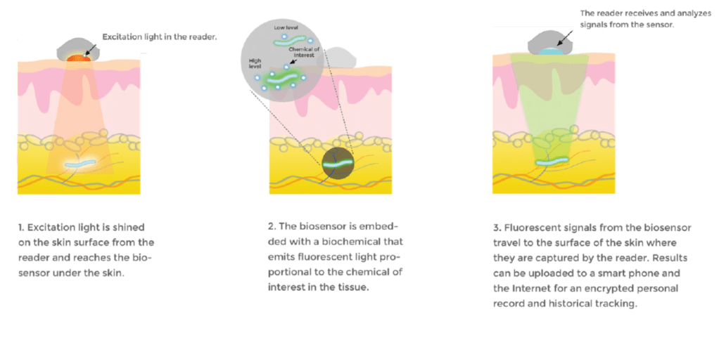 Eine solcher Technologien wird aktiv von Profusa, Inc. entwickelt, einem Unternehmen, das 2016 einen Zuschuss von 7,5 Millionen Dollar von der DARPA – der Forschungs- und Entwicklungsbehörde des US-Militärs – erhielt, um „implantierbare Biosensoren zu entwickeln, die kontinuierlich mehrere Körperchemien überwachen können.“ Anfang dieses Jahres kündigte Profusa eine Studie an, in der untersucht werden soll, wie die Technologie des Unternehmens – einschließlich eines „drahtlosen Lesegeräts, das an der Haut haftet und den Sauerstoffgehalt des Gewebes erfasst und meldet“, und eines 3 mm langen Fadens aus Hydrogel, der mit einer Spritze unter die Haut eingeführt und so programmiert werden kann, dass er „ein fluoreszierendes Signal nach außen sendet, wenn der Körper beginnt, eine Infektion zu bekämpfen“ – zur „Entwicklung eines Früherkennungssystems verwendet werden kann, mit dem nicht nur Krankheitsausbrüche, sondern auch biologische Angriffe und Pandemien bis zu drei Wochen früher erkannt werden können als mit aktuellen Methoden.“ Die Studie soll im laufenden Jahr abgeschlossen werden.