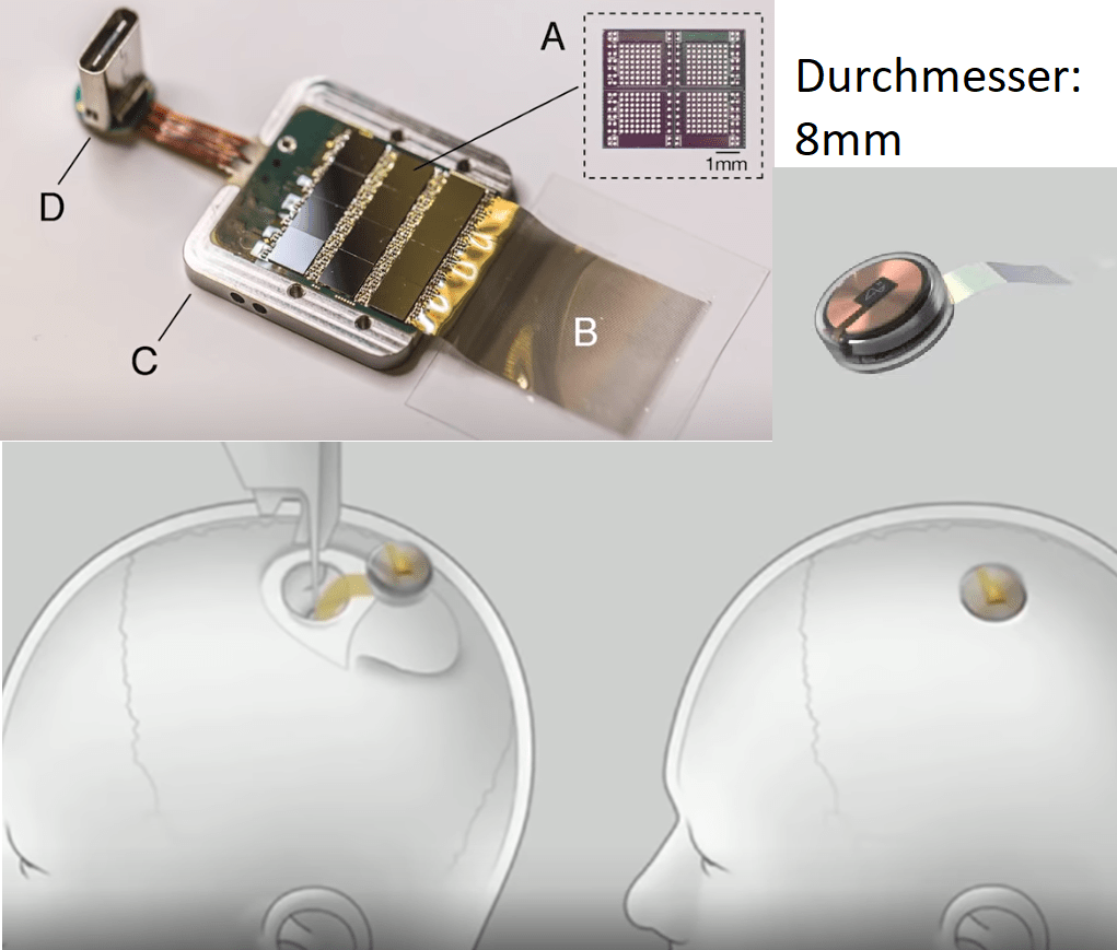 Das ist doch Wahnsinn. Körpersignale die zu Datenerzeugung missbraucht werden. Das Patent geht auch darauf ein wie Gehirnwellen (Gamma, Beta, Alpha, Thelta, Delta) zur Erzeugung von Daten benutzt werden, anhand derer die Erzeugung von digitalen Währungen, also der ökonomischen Teilhabe bestimmt wird. Allerdings können die oben genannten Biosensoren keine Gehirnwellen messen. Dazu braucht es ein implantierbares Brain-to-Machine Interface, oder invasive Neuroprothese wie z.B. das welches von Elon Musk’s Unternehmen Neuralink entwickelt wird. Neuralink ist eine Technologie mit der Menschen nur durch die Benutzung ihrer Gehirne mit Maschinen kommunizieren können. Dabei wird der 8mm große Chip in einer einfachen Operation, durch ein kleines Loch im Schädel, an den äußeren Cortex des Gehirn gelegt. Die schmerzfreie Prozedur dauert nicht einmal 60 Minuten und wird durch vollautomatisierte Roboter durchgeführt. Sobald der Chip installiert wurde kann er elektrische Signale des Gehirns senden und empfangen.