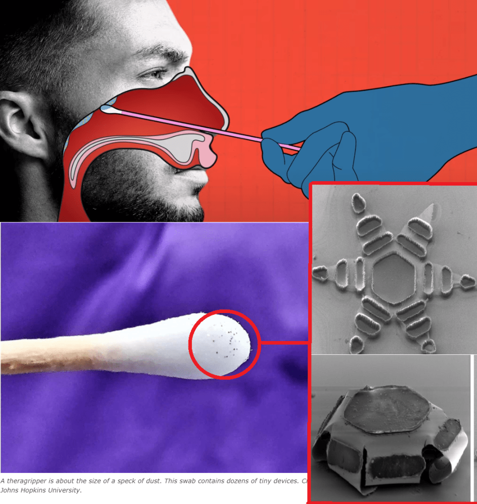 „Formverändernde Mikrovorrichtungen, die die Art und Weise nachahmen, wie sich der parasitäre Hakenwurm im Darm eines Organismus festsetzt, wurden von einem Team aus biomedizinischen Ingenieuren und Johns Hopkins-Forschern unter der Leitung von David Gracias, Ph.D., und Florin M. Selaru, M.D., entworfen und getestet. Diese Mikrovorrichtungen, „Theragripper“, können potenziell jedes Medikament aufnehmen und nach und nach in den Körper einbringen. Sie bestehen aus Metall und formverändernden, dünnen Folien und sind mit hitzeempfindlichem Paraffinwachs beschichtet.“ (Biotecnika)